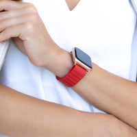 You can never go wrong with a band for Apple Watch in genuine leather. A truly genuine leather experience for the wearer, this magnetic leather iWatch strap called Rosso is designed to look as good as it feels. The grain leather texture does not scratch easily and keeps its shape. Itās easy to wrap around your wrist and will suit any style.